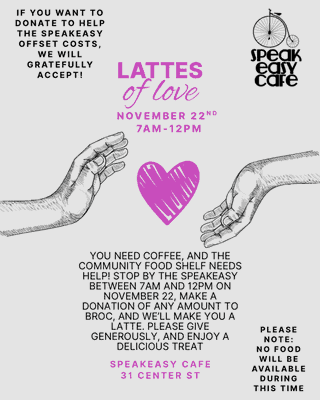 You need coffee, and the community food shelf needs help! Stop by the Speakeasy Cafe between 7am and 12pm on Nov. 22nd, make a donation of any amount to BROC, and we'll make you a latte! Please give generously and enjoy a delicious treat!
